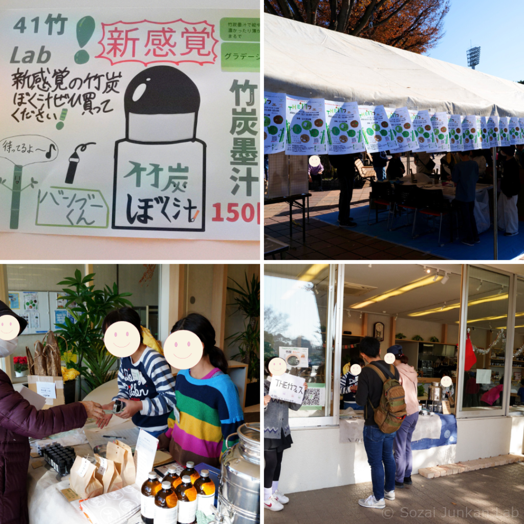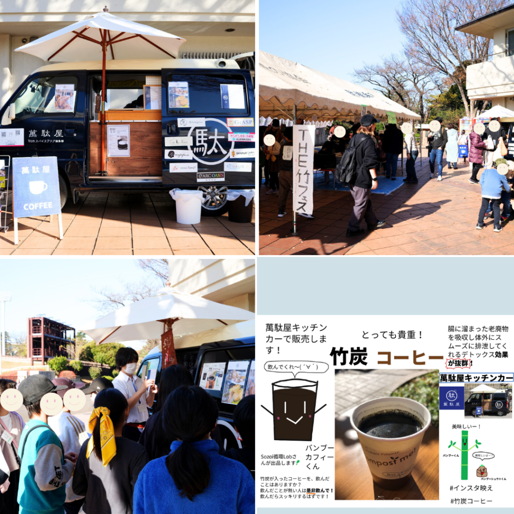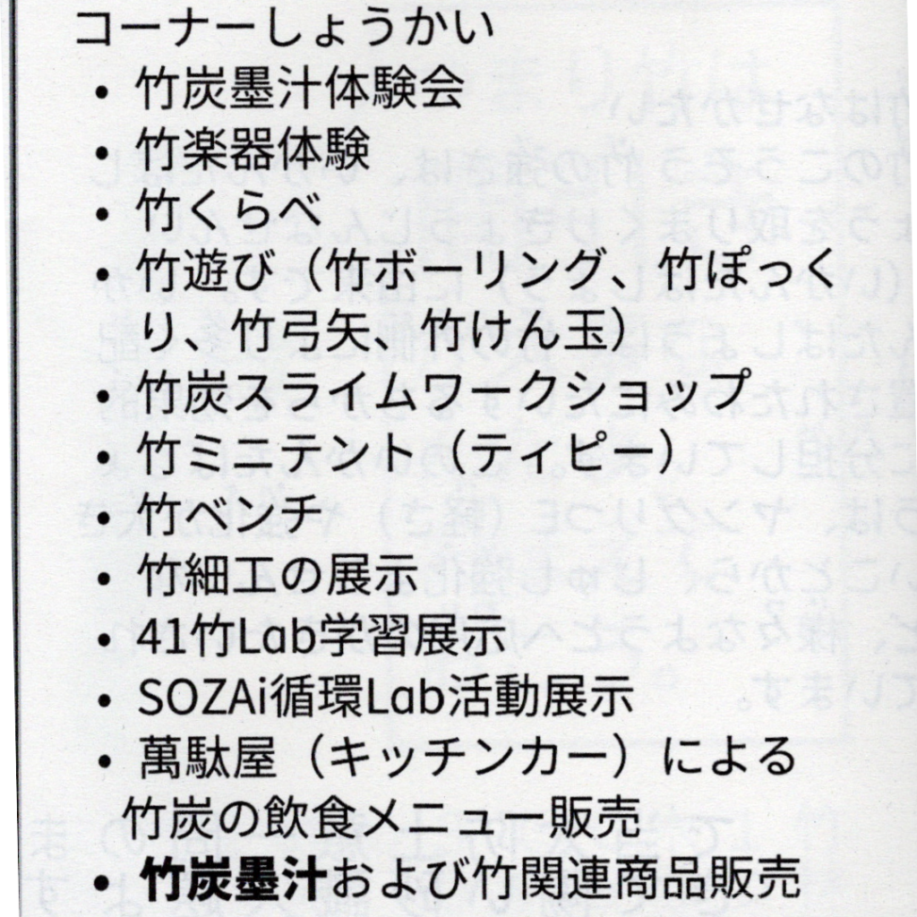 SOZAi循環Labからも各ブースの見守りや、41竹Labのリクエストで出店したキッチンカー&物販「萬駄屋(よろずだや)」で参加。うれしかったのは、これまで「竹割り&炭焼き」「墨汁作り」「竹炭サイエンス」「墨汁アート」「竹ベンチ製作」の授業を担当した方々がブースの見守りで参加して子供たちと再会してくれたことです。子供たちもきっと心強かったと思います。