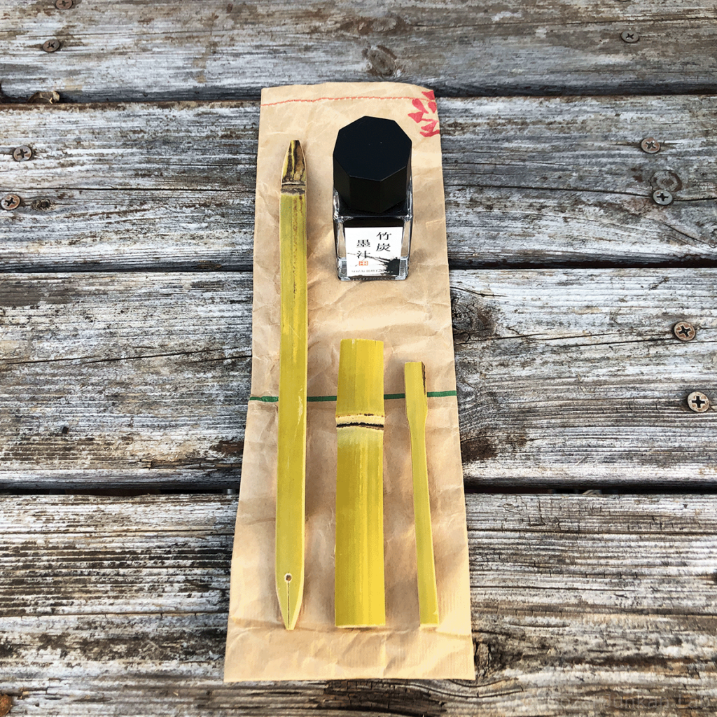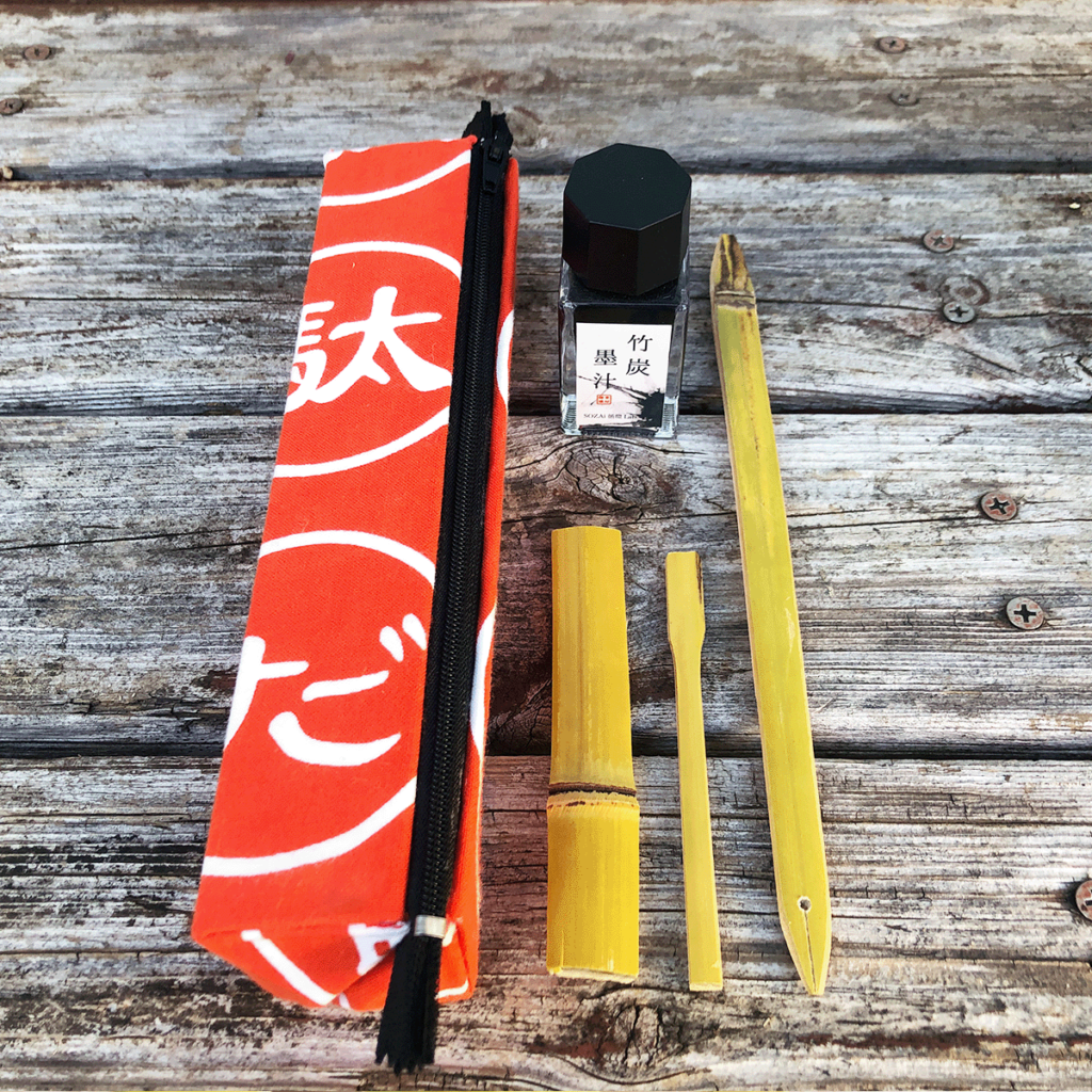 今回、墨汁と同じ竹林の真竹で作った竹ペンをセットにしました。ペン先を墨汁に浸して「つけペン」のようにお使いください。ペン先がへたってきたらカッターなどで削って整えるなど自分好みのペン先にアレンジするとさらに楽しく使えます。竹炭墨汁をかき混ぜるかき混ぜ棒とペン置きも付いていますので合わせてお使いください。