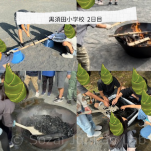牛久保小4年の総合学習支援4日目は、都筑中央公園でいただいた竹を炭焼き用に切って割る作業です。
