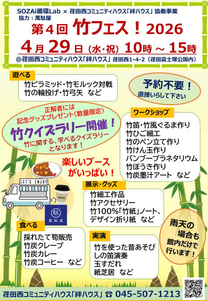 今年も昭和の日に第4回 竹フェス!を開催します。今年は新しい取り組みにもチャレンジ!ぜひお越し下さい。