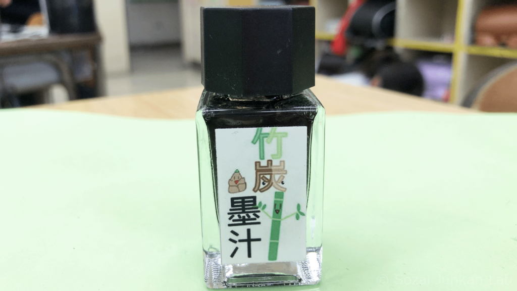 41竹Labが商品開発した「竹炭墨汁」を販売します。容器の選定からラベルのデザイン、原価計算まで、子供たちが互いの意見やアイデアをぶつけあいながら作った商品です。