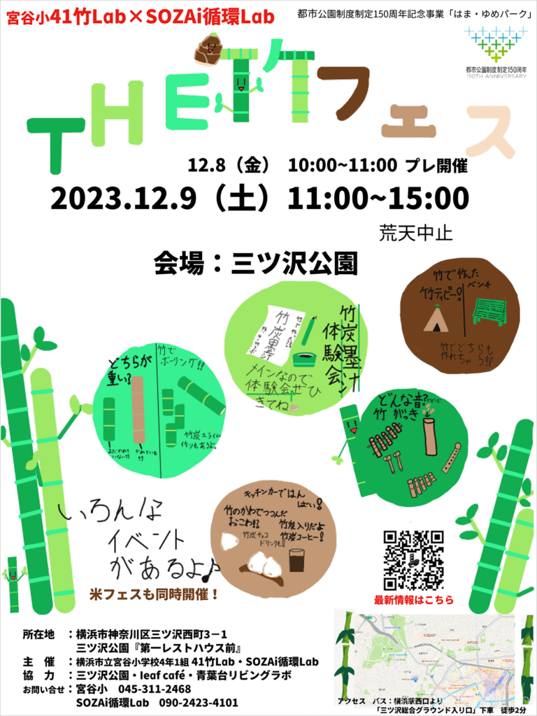 2023年12月9日(土)(プレ開催 12月8日(金))の2日間、横浜市立宮谷(みやがや)小学校4年1組「41竹Lab」とスパイスアップ編集部「SOZAi循環Lab」が「THE 竹フェス」を開催します。また、同校の5年2組による「米フェス」も同時開催します。